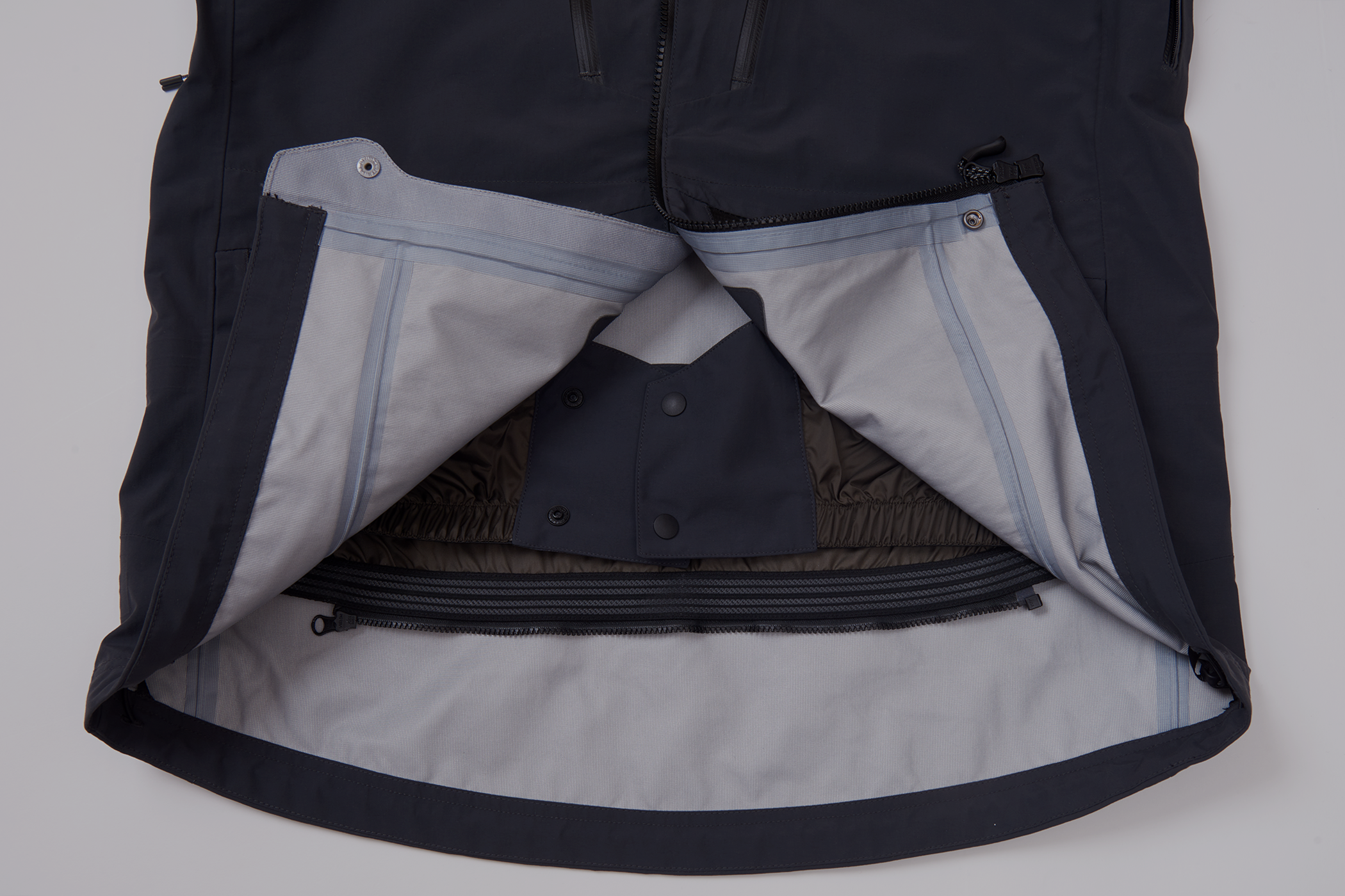 COURSE GUY JACKET・SMILE JACKET のパウダーガードと背中のファスナーを結合すれば、パウダーや雪板・スノースケートで転げても雪の侵入を最小限に抑えてくれます。