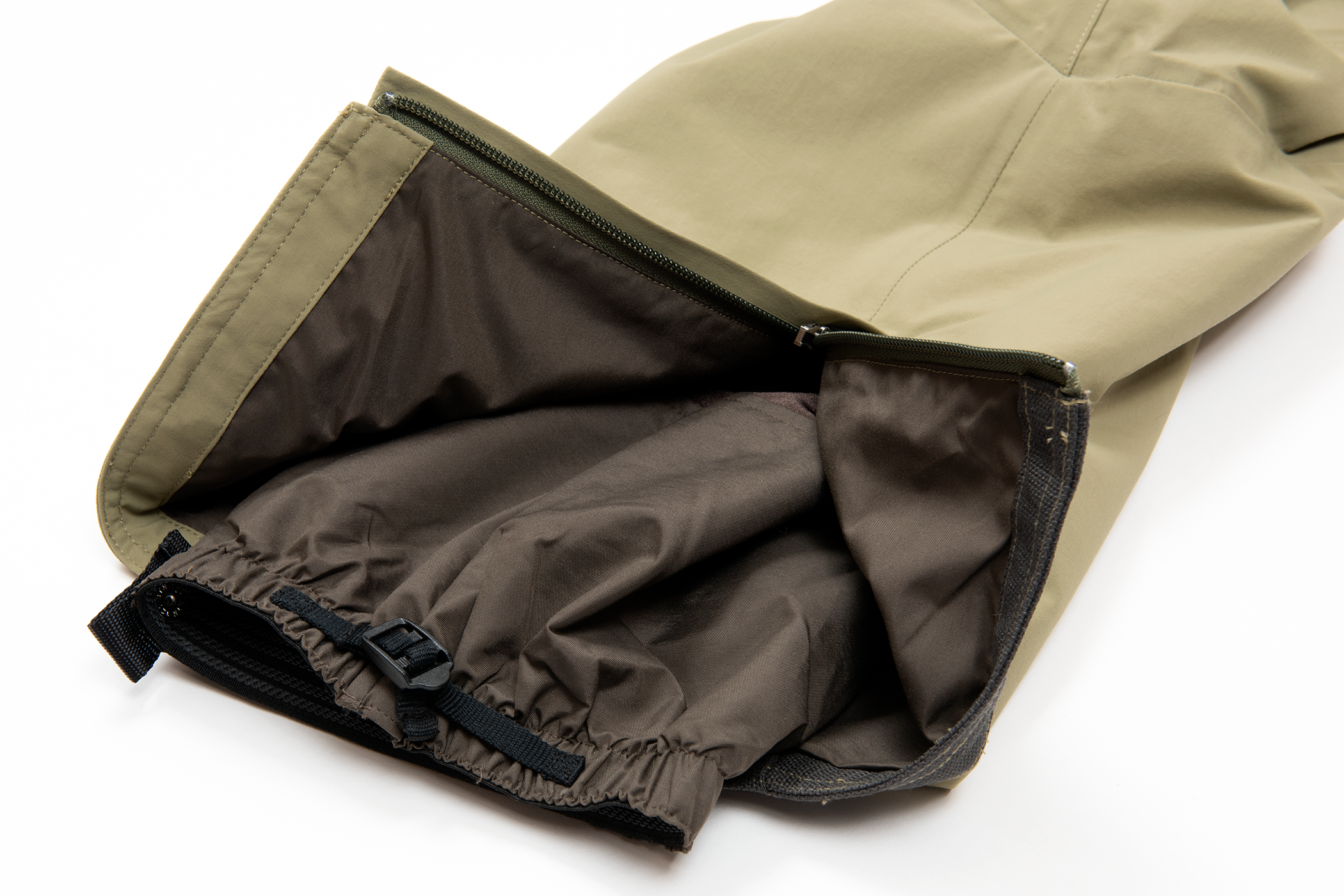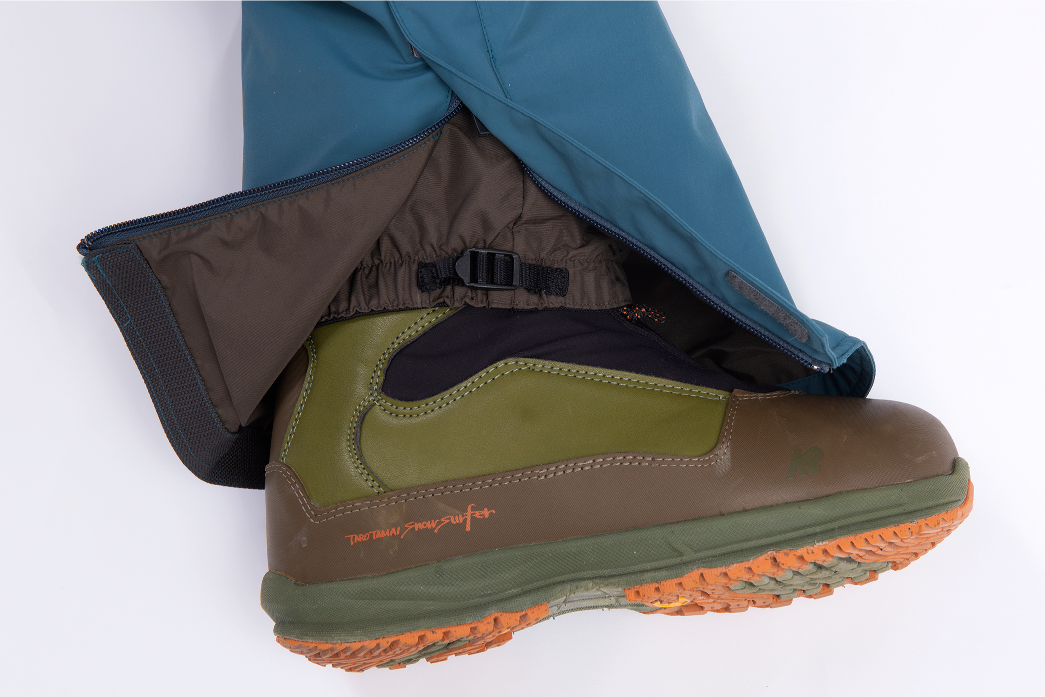 裾の伸縮するパウダーゲーターは下部に防水素材を二重に使用しているため、丈夫で内側が濡れるのを防いでくれます。さらに足首まわりにはフィット感が調整できるパーツを備えています。