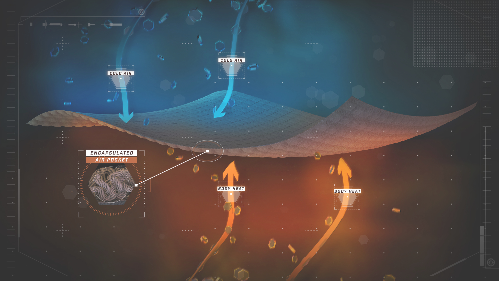 特殊な二重織りによってワッフルのような生地をつくり、その中にポリエステル繊維を封入した構造をしており、内部にデットエア蓄えることができるためあたたかい。