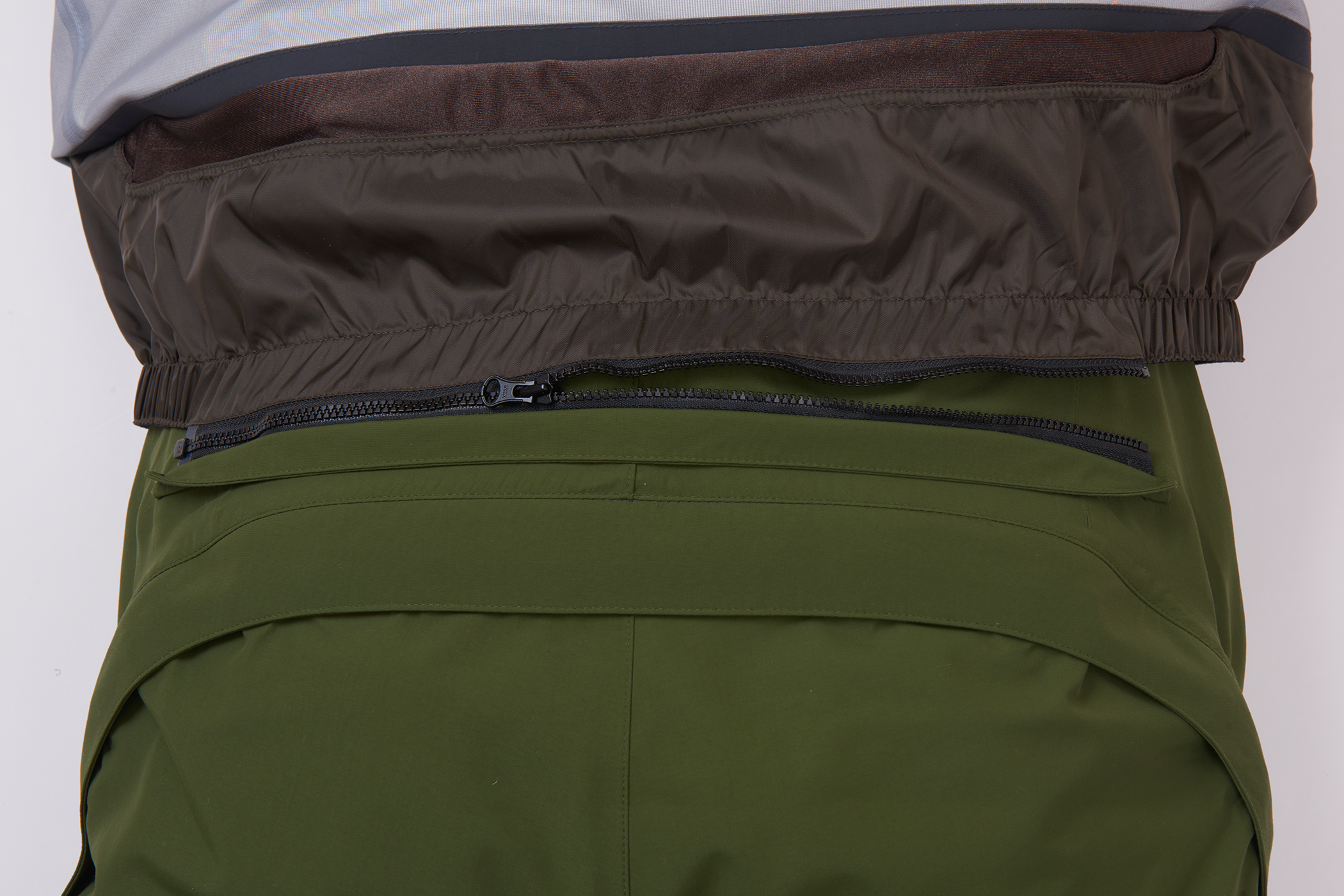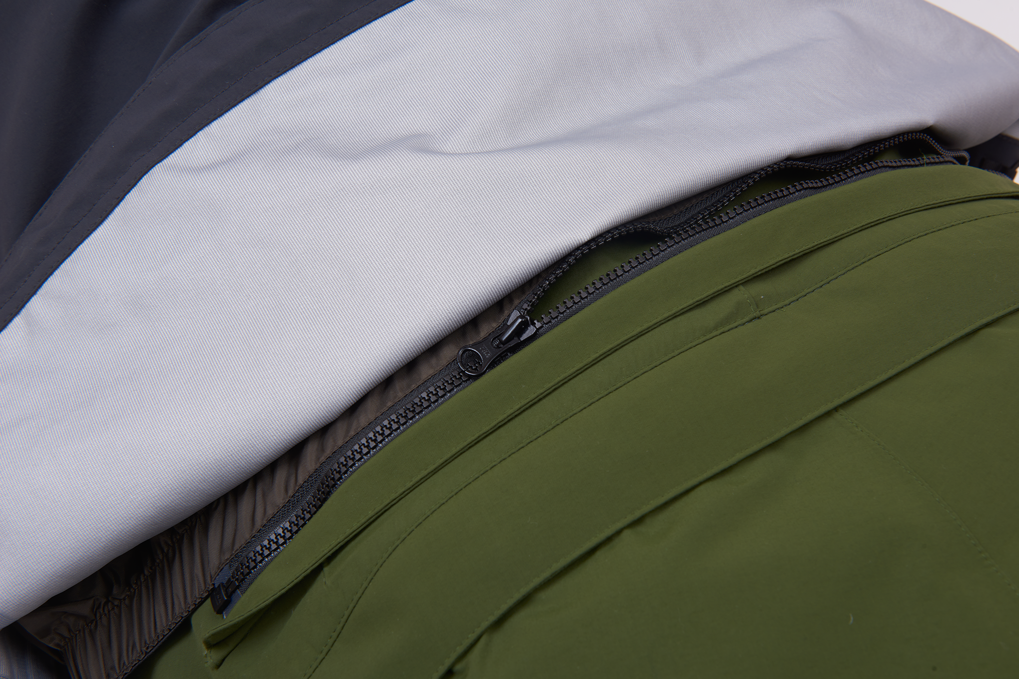 パウダーガード後ろのファスナーで YOTEI PANTS と着脱できるようになっているので、パウダーの中に飛び込んでも雪が入りにくい仕様になっています。