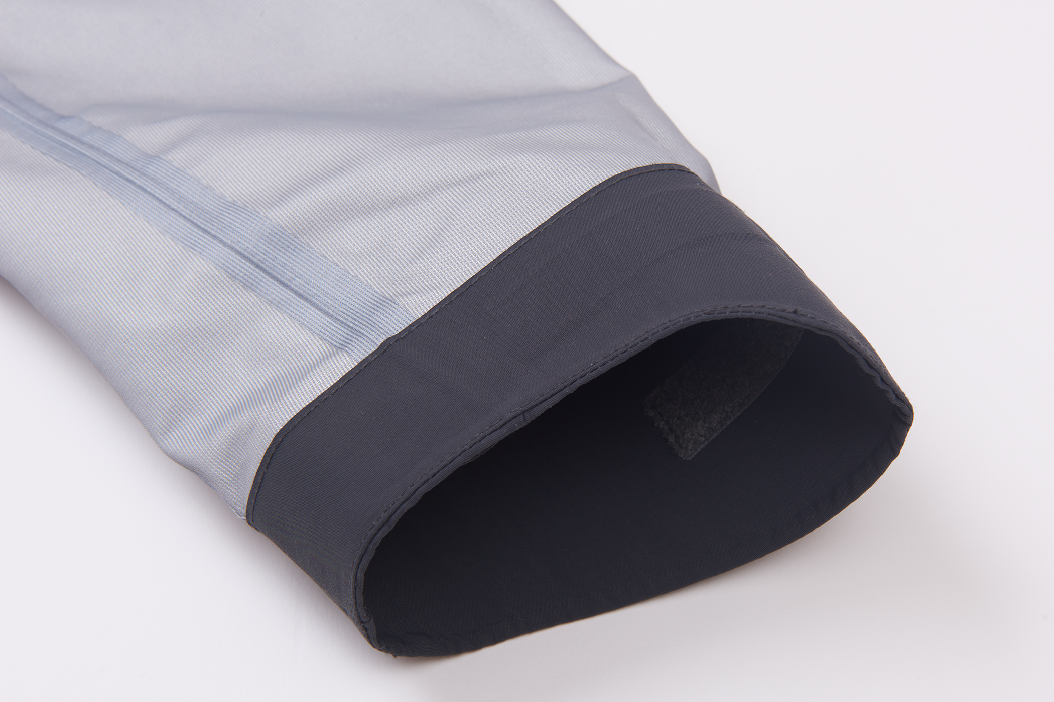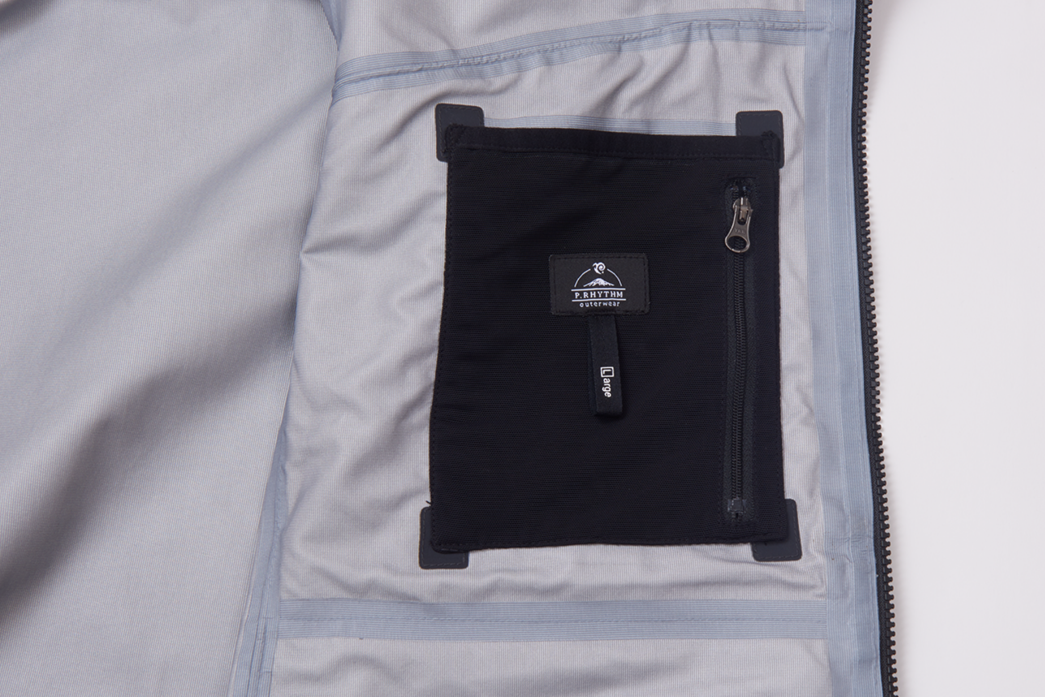 昨シーズンから P.RHYTHM が独自に開発したオリジナルファブリックは、防水性・耐風性・撥水性といった基本性能がアップしたことに加え、さらに軽量になっています。