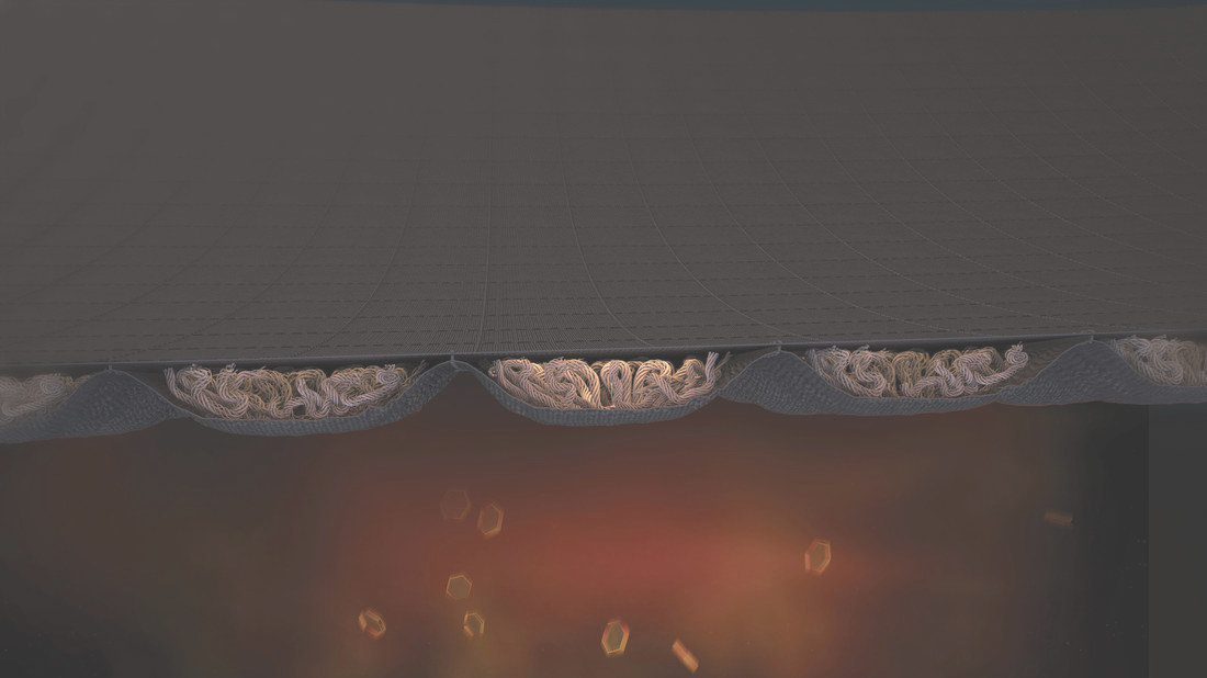 特殊な二重織りによってワッフルのような生地をつくり、その中にポリエステル繊維を封入した構造をしており、内部にデットエア蓄えることができるためあたたかい。